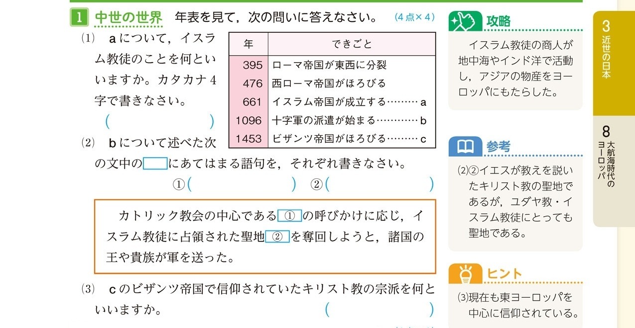 ① カトリック教会 ② イスラム ③ 十字軍 ④ ビザンツ ⑤ オスマン ⑥ ルネサンス