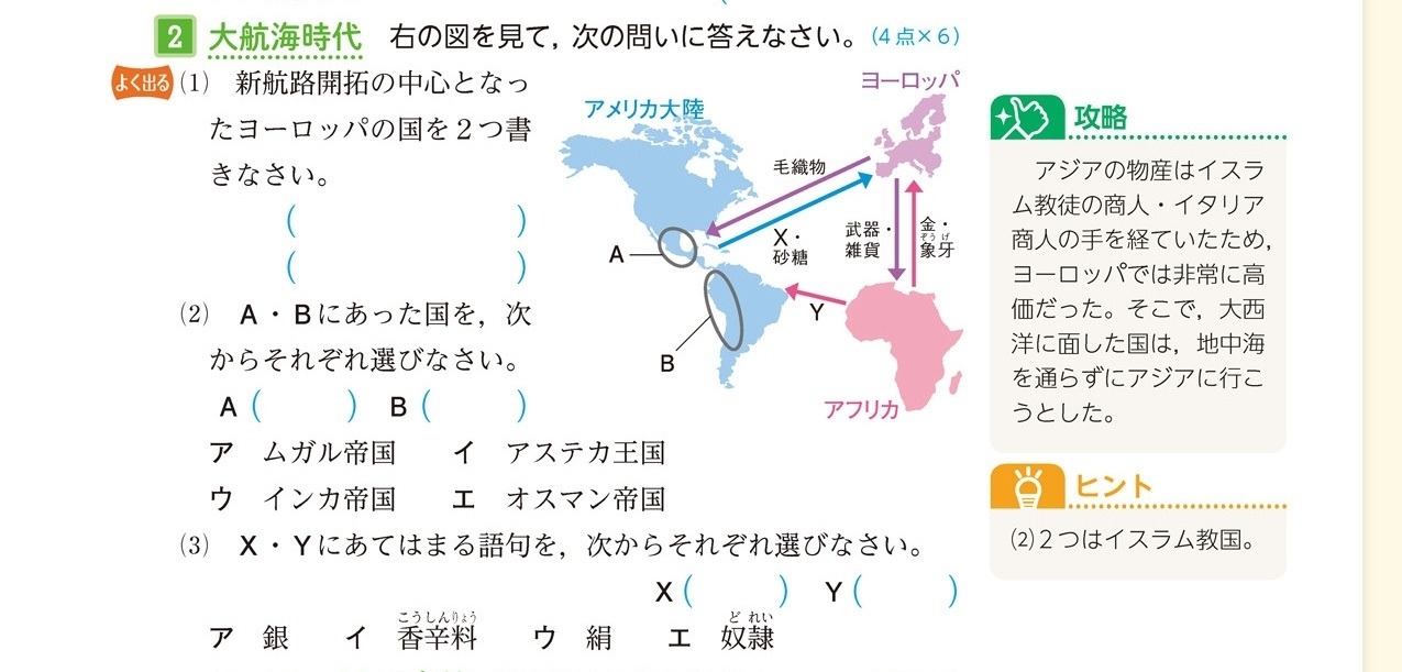 (1)A ア B ウ C イ (2)地中海をオスマン帝国におさえられていたから (3)X エ Y ア