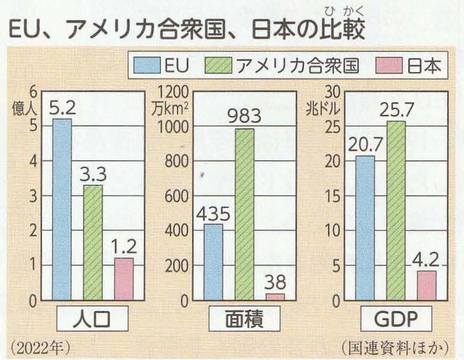 グラフを見ると、EUの人口は5.2億人、日本は1.2億人です。