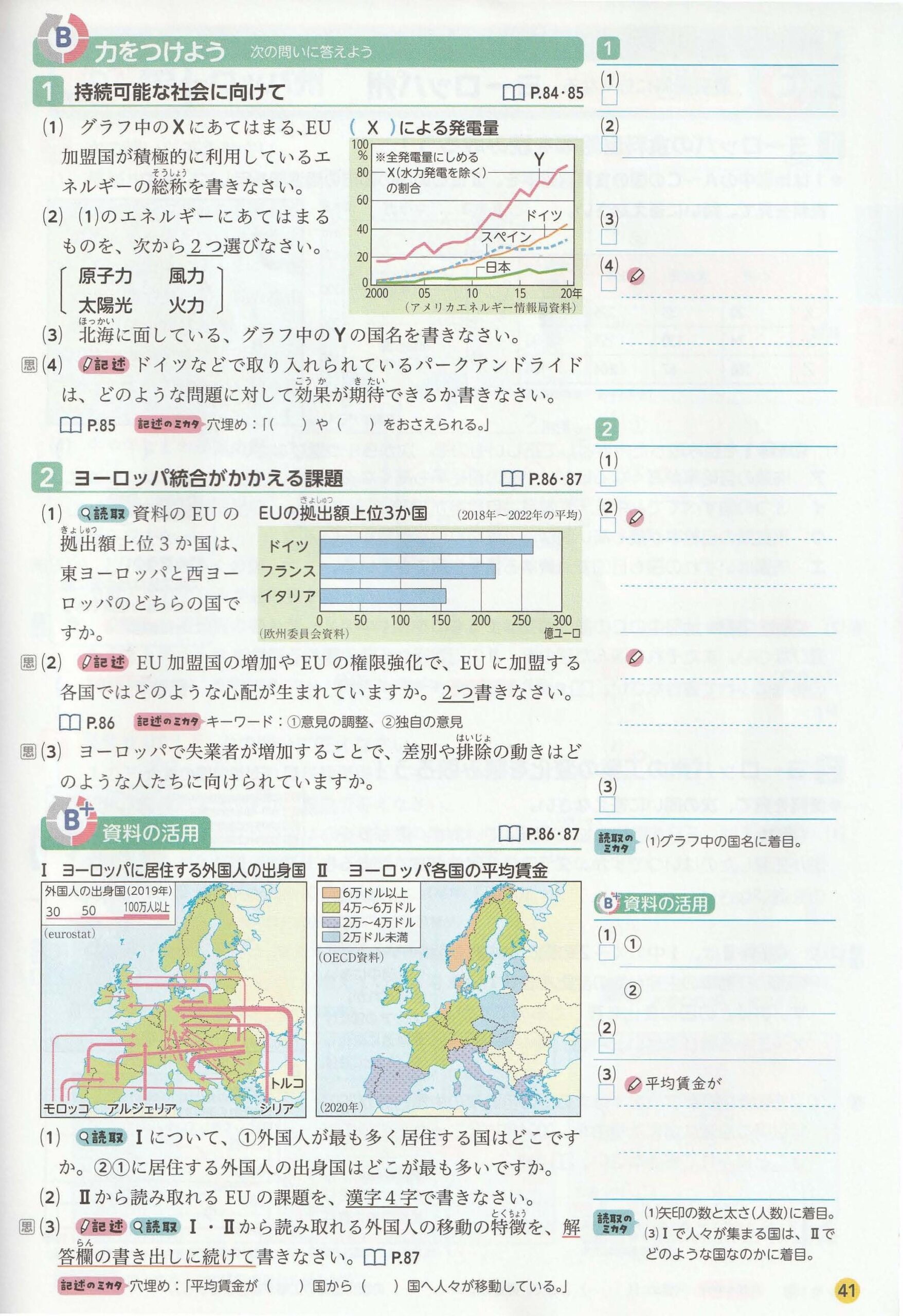 B (1) ① ドイツ ② トルコ (2) 経済格差 (3) 低い・高い