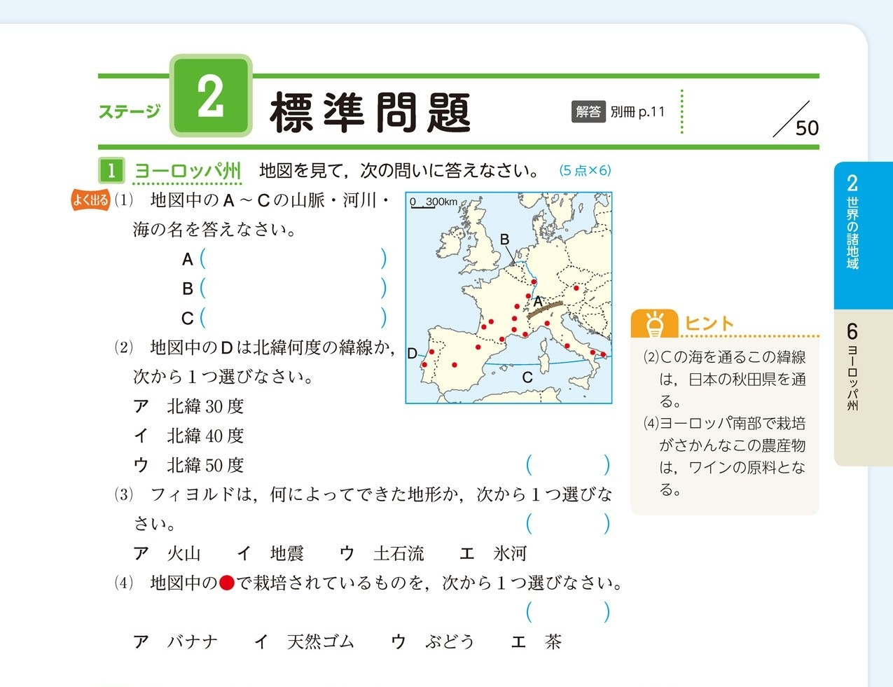 このページは、地図を読み取りながら、ヨーロッパの地形、海、緯線、農業について学ぶ問題です。