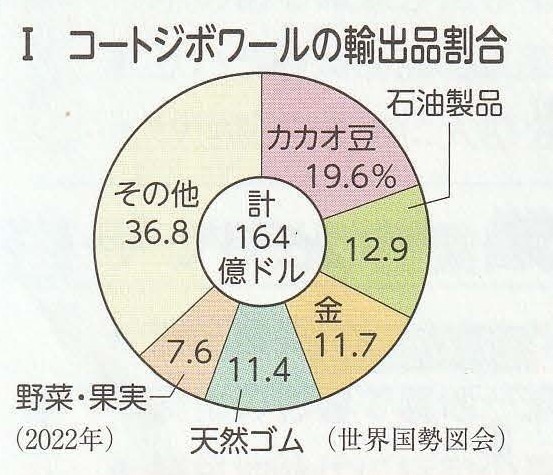 ここで大事なのは、コートジボワールの輸出は、いろいろな品目があるように見えても、特定の農産物や資源の割合が大きいことです。